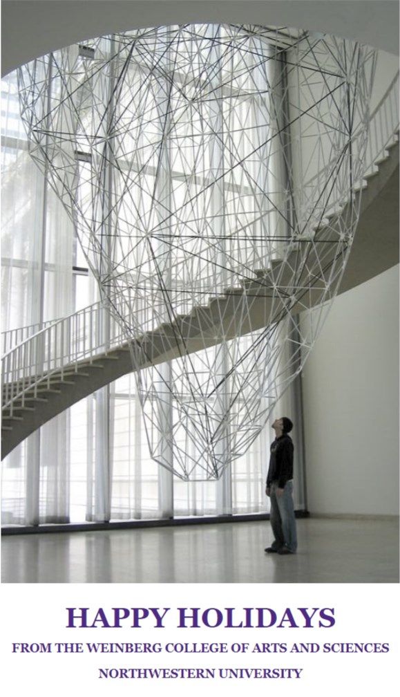Yesterday, Lawrence Brody – as opposed to “Larry Brody” or “Gwen and Larry Brody,” whatever – received the most neutral holiday greeting so far this year. It’s from my not so close personal friends at the Weinberg College of Arts and Sciences, at my alma mater, Northwestern University, and although it’s clearly meant to be a moving work of art, as far as I can see nothing about the card makes what my former neighbors in the Ozarks would call “a lick of sense.”