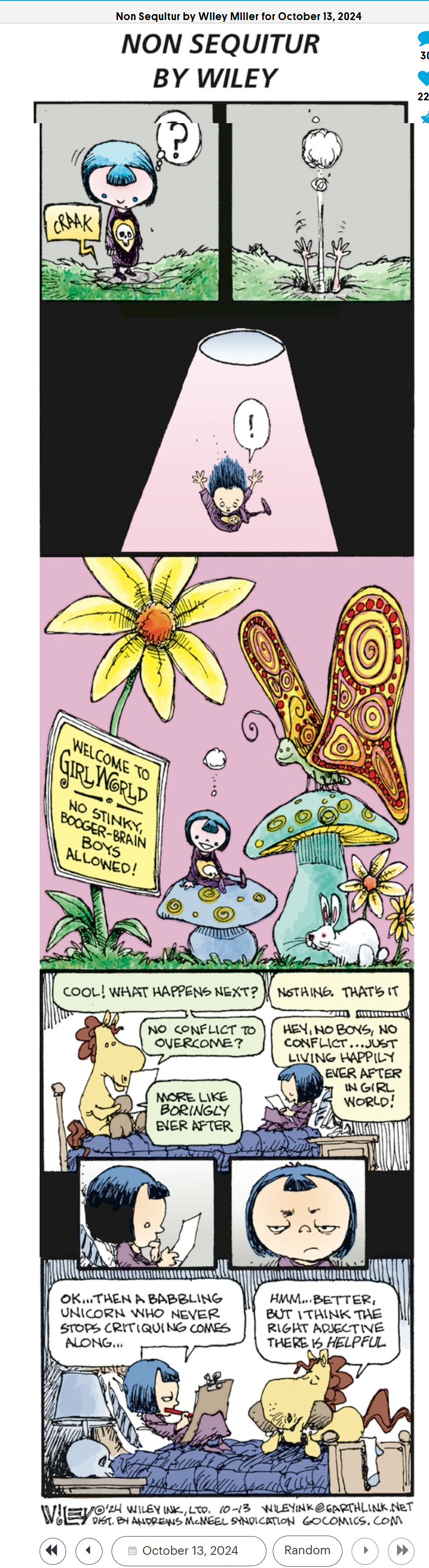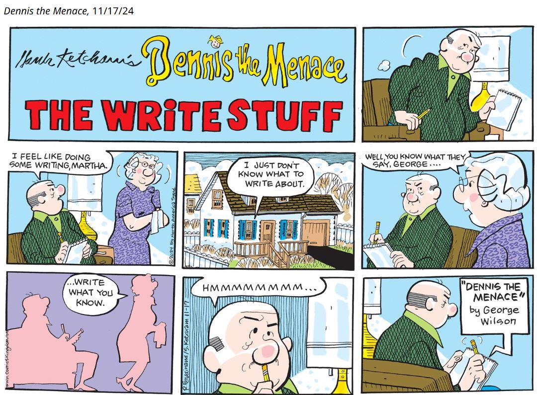 Recently – like since the various dawns of publishing, films, and TV – it’s become a common joke – or maybe wisdom – that deep in our hearts all of us believe we’re writers/creators. Today’s Dennis the Menace shakes that up a bit, and I tend to agree with the result. Not only are we all creators, we’re also characters in what some other-dimensional/other delusional amateur has created.